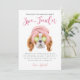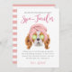 Tarjeta de agradecimiento de papel para fiesta de cumpleaños con tema de spa lindo con ilustración de un perro Charles King Spaniel siendo mimado con una diadema rosa y pepinos en los ojos. El texto en la parte superior dice "gracias por hacer que mi fiesta sea spa-tacular". El texto predeterminado agradece a los invitados por la celebración y el regalo. Este diseño rosa es ideal para una fiesta de niñas.