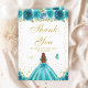 Esta elegante y glamorosa tarjeta de agradecimiento de cumpleaños presenta una hermosa princesa con el pelo rojo marrón y la piel clara en un verde azulado vestido de bola azul. El texto combina el guión manuscrito y las fuentes sans serif modernas para un aspecto elegante y sofisticado. Los arreglos florales, las mariposas y los confeti dorados crean una perfecta mezcla de rústico y moda. Gráficos de www.etsy.com/uk/shop/SunflowerDayLove