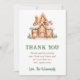 Tarjeta de agradecimiento de fiesta navideña festiva con una casa de jengibre. Perfecto para una fiesta de decoración de casas de jengibre. Las palabras se pueden cambiar para adaptarse a tus propios detalles o requisitos