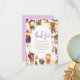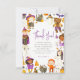 Este diseño lindo presenta un borde pintado a mano o divertidos personajes de Halloween, hay niños disfrazados, gatos negros, murciélagos, calabazas sonrientes, fantasmas, un esqueleto bailando, arañas, globos, estrellas, pociones mágicas, una calavera con ojos de corazón, una escoba voladora, maíz dulce y más. La paleta de colores es una combinación clásica de Halloween: naranja, morado, gris y negro. Una tarjeta de agradecimiento con tema de Halloween para combinar con nuestro diseño de "Chica de fiesta de cumpleaños de Halloween con disfraz lindo". Busque en la colección vinculada en esta página para encontrar artículos que coincidan o visite nuestra tienda para más diseños de fiesta de cumpleaños de Halloween.