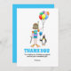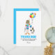 Tarjeta de agradecimiento para una fiesta de cumpleaños en la piscina. Es adecuada para niños y tiene una divertida ilustración con una niña y un pingüino que están listos para la fiesta.