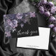 Dark Gothic Floral Wedding Thank You Card — a romantic and moody design perfect for a gothic chic celebration. The front features a mix of deep purple, dark gray, and black flowers and leaves over an off-white background with a black border. “Thank you” is written in elegant script on the front. On the back, the couple’s names and wedding date are displayed in classic serif fonts. Ideal for fall, winter, or gothic-inspired weddings.