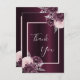 Un fondo de borgoña profundo, decorado con flores de borgoña y rosadas. En la parte delantera, una gran letra script y el texto: Gracias. Parte trasera: Personaliza y agrega tu nota de agradecimiento y nombre.
