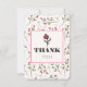 Una tarjeta de agradecimiento con 'Gracias' escrito dentro de un marco de color blanco cáscara de huevo con un borde rosa. La parte posterior tiene un mensaje personalizado que puedes personalizar. El fondo es un patrón de flores silvestres rosadas dibujadas a mano con tallos verdes largos y hojas en un fondo de color blanco cáscara de huevo. Círculos rosados y ramitas también decoran el diseño. Diseño floral caprichoso y bonito.