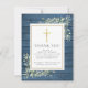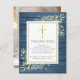 Tarjeta de agradecimiento para funeral cristiano con vegetación sobre fondo de madera azul rústica. Puedes personalizarla con tu propio mensaje de agradecimiento y la foto de tus seres queridos en el reverso. Diseñado por Thisisnotme©