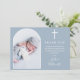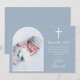 Una tarjeta de agradecimiento de bautizo con una foto de un arco elegante y letra de estilo signature. Personalice con su foto especial y mensaje de agradecimiento en letra blanca chic en un fondo azul polvo. Diseñado por Thisisnotme©