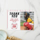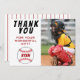 Tarjeta de agradecimiento de cumpleaños de béisbol con foto, mensaje de agradecimiento, nombre y pelotas de béisbol. La tarjeta es de color blanco, rojo y negro. En la parte posterior de la tarjeta hay rayas rojas sobre blanco. Tarjeta de agradecimiento con foto - agregue la foto de sus hijos al template. Personalice la tarjeta con nombre y su texto. Ideal para niños que aman el béisbol y el deporte.