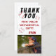 Tarjeta de agradecimiento de cumpleaños de béisbol con foto, mensaje de agradecimiento, nombre y pelotas de béisbol. La tarjeta es de colores blanco, rojo y negro. En la parte posterior de la tarjeta hay una pelota de béisbol con un nombre. Tarjeta de agradecimiento con foto - agregue la foto de sus hijos al template. Personalice la tarjeta con nombre y su texto. Ideal para niños que aman el béisbol y el deporte y quieren agradecer a sus amigos y familiares por un regalo.