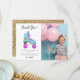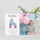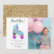 Tarjeta de agradecimiento de fiesta de cumpleaños divertida para una fiesta temática de patinaje sobre ruedas con un ambiente vintage. Hay una ilustración dibujada a mano de un patín en colores rosa y azul con una forma de relámpago de purpurina dorada falsa impresa en él. El mensaje predeterminado dice "gracias por pasar". Puede cambiar la redacción si lo desea. Personalice este producto agregando el nombre y la foto de su hijo.
