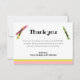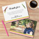 Tarjeta de agradecimiento de doble cara que coincide con las otras piezas de esta colección. Barras rosadas, amarillas y verdes en la parte inferior, con crayones en los mismos colores. Mucho espacio para personalizar y una dulce foto de cumpleaños en la parte posterior.
