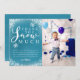 Tarjeta de agradecimiento de cumpleaños con tema de nieve de invierno en azul turquesa con nieve blanca brillante y copos de nieve con un texto tipográfico que dice "gracias por tanta nieve". El mensaje editable agradece a los invitados por venir a la fiesta y por el regalo. El fondo es azul. Ideal para el primer cumpleaños de un niño en la temporada de Navidad. Agrega la foto de tu hijo junto al mensaje.