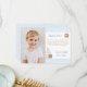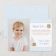 Este diseño de tarjeta de agradecimiento de foto elegante con ilustraciones originales de acuarela y respaldo de gingham azul y blanco sería la forma perfecta de agradecer a los invitados después de la fiesta de cumpleaños temática de "Leche y galletas" de su pequeño niño.