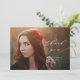 Esta bonita tarjeta de agradecimiento de graduación presenta una foto completa y caligrafía moderna. La superposición de texto blanco incluye la frase "gracias" escrita en letra cursiva elegante, con el nombre del graduado y el año de graduación debajo. La tipografía superpone una foto horizontal completa del nuevo graduado. Puede agregar fotos adicionales y/o un mensaje personalizado en la parte posterior de la tarjeta si lo desea.