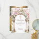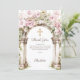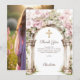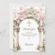 Agrega una foto de tamaño vertical en la parte posterior. Un arco de mármol antiguo con flores rosadas y una cruz dorada. Personaliza y agrega un nombre y nota de agradecimiento.