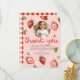 Este diseño de agradecimiento para el primer cumpleaños de niñas, lindo y caprichoso, presenta ilustraciones adorables de fresas rosadas y flores, y se puede personalizar con tu propio mensaje de agradecimiento y la foto de tu niña. El diseño “berry first” también presenta un patrón de gingham rojo a juego en la parte posterior. ¡El diseño perfecto de granja de bayas para el cumpleaños de tu pequeño!