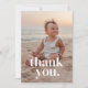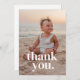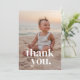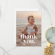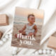 Una tarjeta moderna de agradecimiento de cumpleaños, con tu propia foto y las palabras 'gracias.' en la parte superior. Puedes subir tu propia foto y también cambiar el texto si lo prefieres. Este diseño se ha dejado en blanco en el reverso para que puedas escribir.