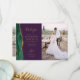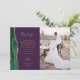 Envíe a su familia y amigos un boda especial gracias con estas tarjetas de fotos personalizados. A la izquierda, las palabras "gracias" aparecen en una elegante tipografía de escritura a mano de color dorado sobre un fondo morado, en un breve y editable mensaje de agradecimiento a los invitados bodas con letra de copperplate, con sus nombres debajo. Una acuarela de color verde esmeralda recortada con un falso purpurina de oro decora el borde izquierdo. En el reverso hay espacio para una segunda foto horizontal.