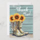 Las tarjetas de botas de girasol occidental de la región de Roustic Country presentan una acuarela de ilustraciones de botas de vaquera llenas de girasoles con el texto "Gracias" en la tipografía de escritura moderna y personalizado con tu mensaje personalizado y tres fotos al revés. Diseñado por Evco Studio www.zazzle.com/store/evcostudio