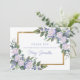Hermosa forma de expresar tu gratitud a familiares y amigos. Un exuberante brote botánico de rosas blancas y flores azules crea hermosos acentos florales en dos esquinas del marco dorado. Tres líneas de texto te permiten personalizar el frente. En el interior puedes colocar tu foto en la parte superior y un sentimiento de agradecimiento. Todo el texto se edita fácilmente.