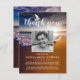 Una nota de agradecimiento para el funeral es una manera sencilla de agradecer a aquellos que le mostraron consuelo durante su tiempo de duelo. Esta tarjeta de simpatía incluye un fondo marino, el amanecer, una paloma blanca, una foto de tu ser querido, y una plantilla de agradecimiento que es fácil de personalizar.