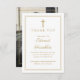 Una tarjeta de agradecimiento de funeral de Celebración de Vida cristiana moderna y elegante con borde dorado y foto en la parte posterior. Diseñada por Thisisnotme