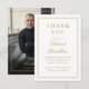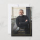 Una tarjeta de agradecimiento funeral moderna y elegante con borde dorado y Celebración de Vida con foto en el reverso. Diseñada por Thisisnotme©