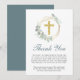 Una elegante tarjeta de agradecimiento funeraria que incluye un ilustracion acuarela de una cruz de oro simple dentro de una corona dorada geométrica adornada con vegetación de eucalipto verde sabio y "Gracias" en un guión de caligrafía verde sabio. Personalice su mensaje de agradecimiento y agregue una cita inspiradora o un pasaje bibliográfico debajo.