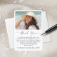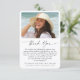 Send thanks for the kindness and compassion shown during your time of sorrow with these personalized photo thank you cards for a funeral, memorial or Celebration of Life event featuring a treasured photo of your loved one, your preprinted custom message and elegant script typography. The back is blank for the option of handwriting personal notes or add another photo in EDIT. ASSISTANCE: For help with design modification, transferring the design to another product or if you would like coordinating items, contact the designer BEFORE ORDERING via the Zazzle Chat MESSAGE tab below or email makeitaboutyoustore@gmail.com.