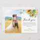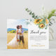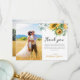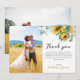 Tarjetas de agradecimiento de boda con girasoles y eucalipto en acuarela rústica con 2 fotos y letra script y tipografía moderna.