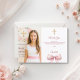 Add a vertical size photo. A pink bow and a golden cross as decor. Personalize and add a name and thank you note.
