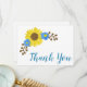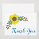 Mostrando la gracia de los girasoles, esta impresionante Tarjeta de Agradecimiento presenta un hermoso gráfico de girasol en la esquina superior izquierda sobre un fondo blanco. En la parte inferior derecha está "Gracias" escrito de manera hermosa en texto cursivo azul. La parte trasera también tiene fuente azul sobre fondo blanco. Hay una plantilla para personalizar tu texto. Personaliza hoy tu tarjeta de agradecimiento de girasoles.