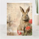 Delante de un fondo abstracto se representa un conejo marrón que mira directamente al espectador con una mirada atenta. En primer plano, el conejo se acompaña de un tallo de rosas rosadas vibrantes que contrasta con los tonos suaves del fondo.