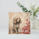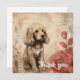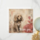 Un cachorro marrón dorado con piel suavizada está sentado justo al lado de un par de rosas grandes y estilizados. El fondo presenta tonos beige abstractos con contornos florales sutiles y marcas de escritura, lo que le da una sensación suave y vintage a toda la composición.