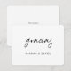 Esta tarjeta de agradecimiento simple y elegante presenta 'gracias' en una escritura relajada, cálida y moderna en negro y funciona maravillosamente para diversas ocasiones. Este elemento del diseño no se puede alterar. Puedes cambiar el color o la fuente o el tamaño de cualquier otro texto. Hemos elegido negro como configuración predeterminada para el otro texto en la parte delantera y trasera. Hemos puesto texto de marcador de posición en la parte trasera para que lo reemplaces con tu mensaje. Pero por favor no te sientas restringido por esto. Si prefieres dejar la parte trasera en blanco para escribir una nota manuscrita en cada tarjeta, puedes hacerlo. Solo asegúrate en cualquier caso de eliminar nuestro texto de ejemplo. No hemos elegido un color predeterminado para el fondo en ninguno de los lados. En su lugar, el valor predeterminado se establece simplemente en el papel en sí como color base. Puedes cambiar esto seleccionando un color en las herramientas de edición si lo deseas. Un diseño minimalista como este pone el papel en un enfoque más nítido e invita a agregar tus propias palabras manuscritas en la parte trasera, ya sea tus firmas o un mensaje también. Hemos elegido mate en lugar de semi-brillante como la opción de papel predeterminada, ya que es adecuada para escribir tu propio mensaje y no se correrá. También podrías considerar actualizar a algo con textura como 'Laid' o 'Felt White'