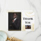 Tarjetas de agradecimiento sencillas, llanas y elegantes adecuadas para todas las ocasiones. Las palabras "gracias" aparecen en una fuente fluida de estilo caligráfico negro que es elegante y con estilo. Hay formas geométricas y espirales doradas falsas dispersas alrededor de las fotos y los bordes que dan un aspecto chic y sofisticado al diseño general. Hay 2 plantillas de fotos para tus imágenes especiales en la parte delantera y plantillas en la parte posterior de la tarjeta para tu mensaje personalizado de agradecimiento a familiares o colegas de trabajo. Ideales para eventos corporativos; agradecimientos de graduación o cualquier ocasión especial en la que desees agradecer a los invitados por acompañarte.