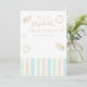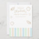 Grad club beach party with cabana stripes in shades of mint green, coastal blue and sandy brown with seashells. Photo template via Pixabay licensed under CC0 and must be replaced with your own photo.