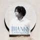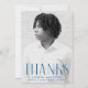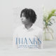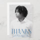 Simple carta de agradecimiento por graduación que presenta la foto vertical del graduado con "Gracias" mostrado en letras azules y modernas de arte deco. Personalice la parte delantera de la tarjeta de agradecimiento de graduación fotográfica agregando el nombre del graduado, el nombre de la escuela y el año de graduación. La tarjeta se invierte para mostrar el mensaje de agradecimiento de su personalizado con letras azules o dejar la espalda en blanco para escribir a mano la suya!