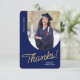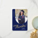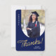 Esta tarjeta de agradecimiento de graduado plano incluye una foto vertical con un borde arqueado. Personalice esta tarjeta azul marino y dorado de agradecimiento con su propio mensaje o utilice la que se muestra.