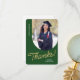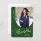 Esta tarjeta de agradecimiento de graduado plano incluye una foto vertical con un borde arqueado. Personalice esta tarjeta de agradecimiento de color verde oscuro y oro con su propio mensaje o utilice la que se muestra.