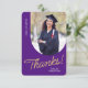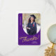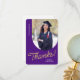 Esta tarjeta de agradecimiento de graduado plano incluye una foto vertical con un borde arqueado. Personalice esta tarjeta morada y dorada con su propio mensaje o utilice la que se muestra.