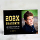 La moderna invitación de graduación y tarjeta de agradecimiento presenta un diseño sencillo y masculino con letras inspiradas en la camiseta deportiva, perfecto para tu estudiante y atleta varsity. Los colores negro, dorado y blanco se pueden personalizar completamente. Incluya un retrato senior o una foto de graduación/fiesta.