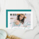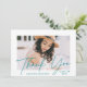 Tarjeta de agradecimiento para la graduación de fotos moderna que incluye la foto del graduado con "gracias" en un overlay manuscrito verde azulado de caligrafía. Personalice la parte delantera de la tarjeta de agradecimiento de graduación agregando el nombre del graduado. La tarjeta de agradecimiento a la foto se revierte para mostrar su mensaje personalizado con un patrón geométrico punteado verde azulado y blanco a la moda. Eliminar el mensaje del personalizado para escribir a mano el suyo propio.