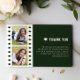 Comparte tu agradecimiento a los invitados que siguen tu casa abierta de graduación con esta moderna tarjeta de agradecimiento de graduación de Collage de fotos Green Filmstriation. El diseño de la tarjeta incluye una tira de película y dos colocaciones fotográficas, adornos de tapón de graduación con un guión elegante y una tipografía. Personaliza tu propio mensaje de agradecimiento a tus invitados.