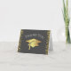 This modern design features a graduation hat and confetti in gold on a background of grey with white text.