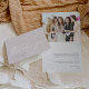 Tarjetas de agradecimiento dobladas simples y elegantes que presentan "gracias" en una moderna letra de caligrafía manuscrita sobre un suave fondo taupe rosa. Personalice con su texto personalizado debajo; se muestra con "de la futura Sra. [nombre]". Agregue un mensaje personal preimpreso en el interior, así como una foto de su evento.