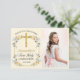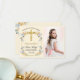 Agradezca a su familia y amigos por asistir a la Primera Comunión de su hija enviándoles una tarjeta de agradecimiento con foto de Primera Comunión. Esta bonita tarjeta de agradecimiento de Comunión Buttercream para niña. Esta tarjeta de agradecimiento de Comunión presenta una hermosa cruz dorada con un marco dorado sobre un suave fondo amarillo buttercream. Un ramo de hermosas flores de acuarela en color melocotón y azul se colocan en cada esquina. Ponga la foto de su hijo en la parte frontal y escriba un mensaje personal preimpreso con una firma en el dorso para su conveniencia.