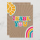 El tema de la ducha de bebé Groovy con el signo de la paz incorporado en el texto "Gracias" con texto personalizado por su nombre. Sunshine en la parte superior izquierda y arcoiris a la derecha sobre fondo de arrebato inspirado en el cardstock.