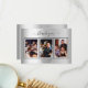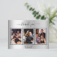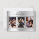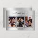 Añade 3 fotos de tu cumpleaños, tamaño vertical, una fecha, nombre y la nota de agradecimiento. Un fondo falso de aspecto plateado con texto negro y marco. El texto: Gracias en la parte delantera y tu nombre en la parte trasera está escrito con un elegante guión con letras a mano con barras.