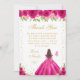 This elegant and glamorous sweet sixteen thank you card features a beautiful princess with brunette hair and fair skin in a hot pink ball gown. The text combines handwritten script and modern sans serif fonts for a classy and sophisticated look. The floral arrangements, butterflies and gold confetti create the perfect blend of rustic and chic.