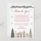 Share your gratitude with this It Takes a Village winter baby shower thank you card. The design features a cozy watercolor village framed by evergreen trees and delicate snowflakes, with a lush greenery garland across the top. “Thank You” is displayed in elegant red script, matching the collection’s signature festive style. The heartfelt message below expresses appreciation to your guests for their love, support, and gifts, with space to personalize the mom-to-be’s name or closing sentiment. Perfect for winter or holiday baby showers, this card coordinates beautifully with the matching invitation and décor.